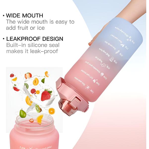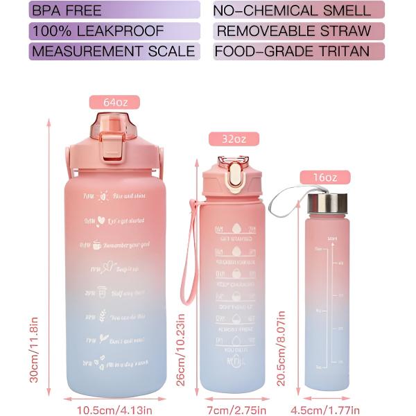 Tato sada obsahuje tři lahve na vodu v gradientních barvách, z nichž každá je opatřena motivačním citátem na přední straně a měřením objemu na zadní straně.