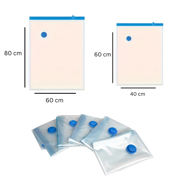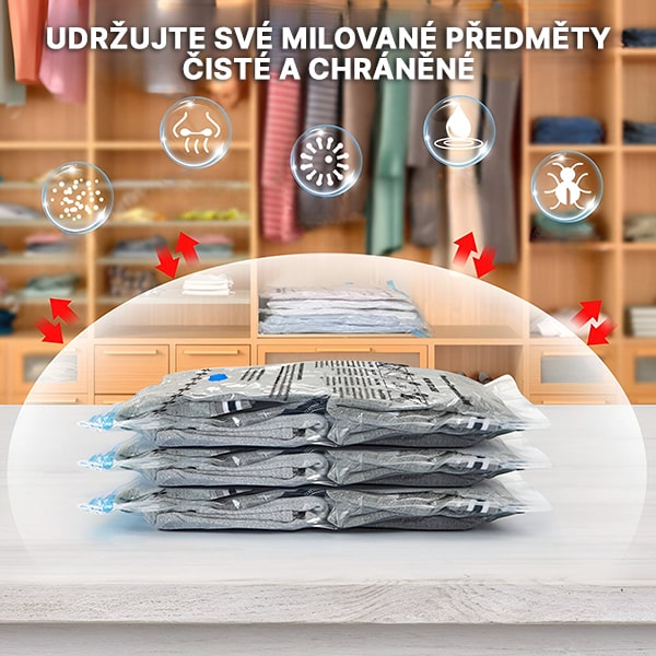 Dochází vám místo ve skříni? Máte problém dostat vše do kufru? Vakuové úložné pytle VACKBAGS zmenší objem vašich věcí až o 80 % a okamžitě vám poskytnou místo na to důležité. Jednoduše zabalte oblečení nebo lůžkoviny, pytel uzavřete a pomocí jakéhokoli domácího vysavače odsajte vzduch – trvá to méně než 60 sekund. Více místa, méně nepořádku, žádné starosti.