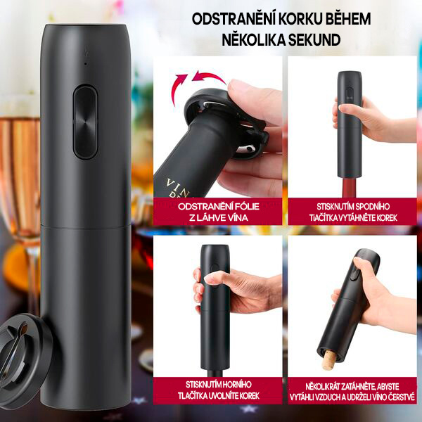 🍷 Otevře jakoukoli láhev s korkem za 7 sekund – stisknutím jednoho tlačítka